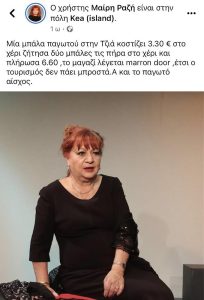 Πήγε στη Τζιά και δυστυχώς δεν περνάει καλά. Η Μαίρη Ραζή καταγγέλλει την ακρίβεια του νησιού και δηλώνει την απογοήτευση της. Η αγαπημένη ηθοποιός με ανάρτηση της εξηγεί πως για δυο μπάλες παγωτού στο χέρι πλήρωσε 6.60 ευρώ, ενώ κατονομάζει το μαγαζί και τονίζει πως το παγωτό ήταν αίσχος!