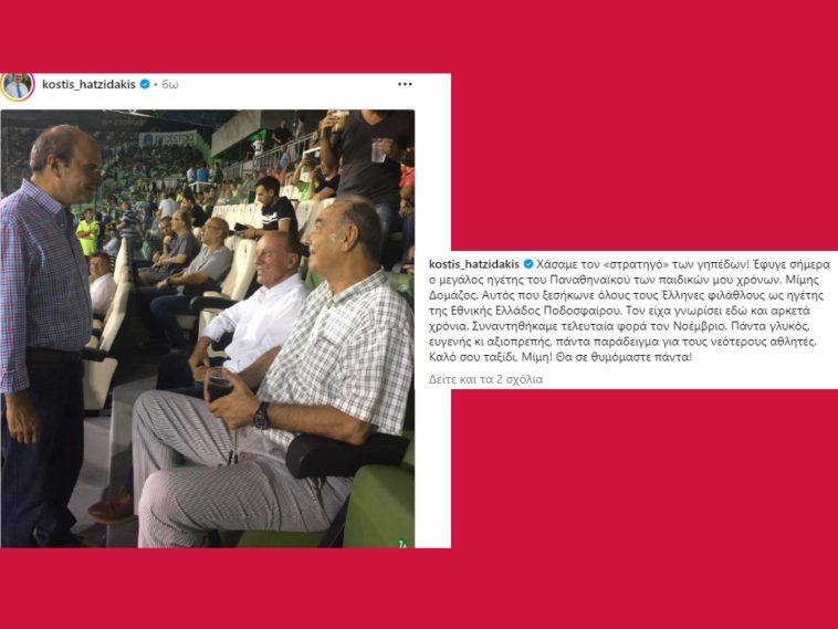 Ο Υπουργός γράφει: «Χάσαμε τον «στρατηγό» των γηπέδων! Έφυγε σήμερα ο μεγάλος ηγέτης του Παναθηναϊκού των παιδικών μου χρόνων, Μίμης Δομάζος. Αυτός που ξεσήκωνε όλους τους Έλληνες φιλάθλους ως ηγέτης της Εθνικής Ελλάδος Ποδοσφαίρου. Τον είχα γνωρίσει εδώ και αρκετά χρόνια. Συναντηθήκαμε τελευταία φορά τον Νοέμβριο. Πάντα γλυκός, ευγενής κι αξιοπρεπής, πάντα παράδειγμα για τους νεότερους αθλητές. Καλό σου ταξίδι, Μίμη! Θα σε θυμόμαστε πάντα!»