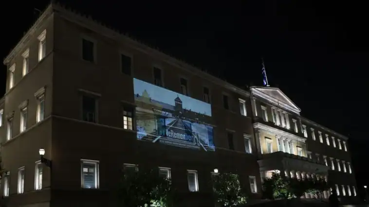 Η πρόσοψη του Μεγάρου της Βουλής των Ελλήνων φωταγωγήθηκε το βράδυ της Τρίτης στο πλαίσιο της Διεθνούς Ημέρας Μνήμης του Ολοκαυτώματος, με το θεματικό λογότυπο της διεθνούς εκστρατείας #WE REMEMBER.