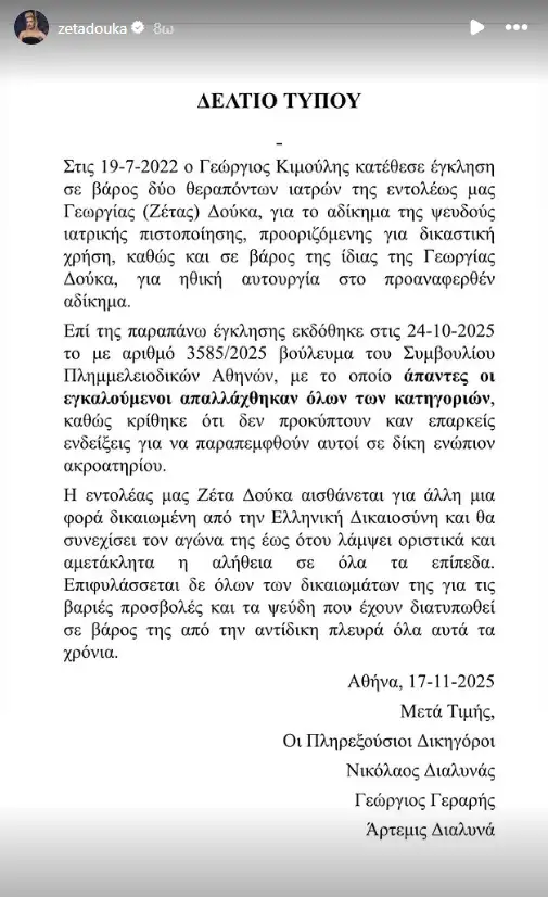 Σύμφωνα, λοιπόν, με βούλευμα του Συμβουλίου Πλημμελειοδικών Αθηνών όλοι οι εγκαλούμενοι απαλλάχθηκαν από τις κατηγορίες. Η ανακοίνωση των δικηγόρων της Ζέτας Δούκα, Νικόλαος Διαλυνάς, Γεώργιος Γεραρής και Άρτεμις Διαλυνά εξέδωσαν την Τρίτη (18.11.2025) τη σχετική ανακοίνωση, αναφέροντας ότι σύμφωνα με βούλευμα του Συμβουλίου Πλημμελειοδικών Αθηνών, άπαντες οι εγκαλούμενοι απαλλάχθηκαν όλων των κατηγοριών, καθώς κρίθηκε ότι δεν προκύπτουν καν επαρκείς ενδείξεις για να παραπεμφθούν αυτοί σε δίκη ενώπιον ακροατηρίου.