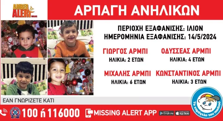 Αργά το βράδυ της Τρίτης ενεργοποιήθηκε Amber Alert μετά από καταγγελία της μητέρας τους και ύστερα από εισαγγελική εντολή. Η κινητοποίηση των αρχών είναι μεγάλη για τον εντοπισμό των τεσσάρων παιδιών και μάλιστα δόθηκαν στη δημοσιότητα οι φωτογραφίες και τα στοιχεία τους. Οι έρευνες γίνονται στο Ίλιον, αλλά και στις γειτονικές περιοχές.