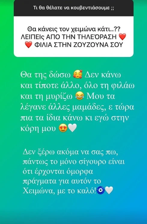 - Για την επιστροφή της στην τηλεόραση, απάντησε: «Θέλω πολύ να επιστρέψω. Με ένα όμορφο πρότζεκτ και με μία συνθήκη που να μπορώ να συνδυάσω εργασία και ποιότητα ζωής με την οικογένειά μου! Ακούγεται λίγο δύσκολο αλλά σε όλα υπάρχει χρυσή τομή (αν θες πραγματικά να τα καταφέρεις). Έρχονται όμορφα πράγματα για αυτόν τον χειμώνα».