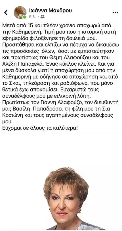«Μετά από 15 και πλέον χρόνια αποχωρώ από την Καθημερινή. Τιμή μου που η ιστορική αυτή εφημερίδα φιλοξένησε τη δουλειά μου. Προσπάθησα και ελπίζω να πέτυχα να δικαιώσω τις προσδοκίες όλων, όσοι με εμπιστεύτηκαν και πρωτίστως του Θέμη Αλαφούζου και του Αλέξη Παπαχελά. Ένας κύκλος κλείνει. Και για μένα δύσκολα γιατί η αποχώρηση μου από την Καθημερινή με οδήγησε σε αποχώρηση και από το Σκαι, τηλεόραση και ραδιόφωνο, που μόνο θετικά έχω αποκομίσει. Ευχαριστώ τους συναδέλφους μου με ειλικρινή λύπη. Πρωτίστως τον Γιάννη Αλαφούζο, τον διευθυντή μας Βασίλη Παπαδρόσο, τη φίλη μου τη Σια Κοσιώνη και τους αγαπημένους συναδέλφους μου. Εύχομαι σε όλους τα καλύτερα!» έγραψε η Ιωάννα Μάνδρου ευχαριστώντας παράλληλα την ιδιοκτησία, τη διεύθυνση και τους συναδέλφους της.