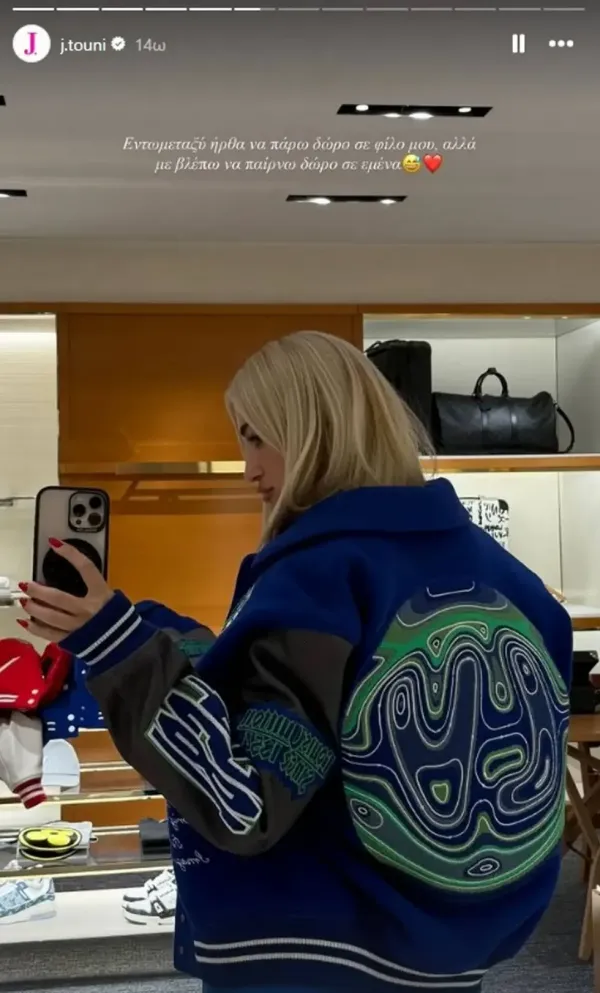 Η ίδια σχολίασε φορώντας το κολλεγιακό μπουφάν: « Εντωμεταξύ ήρθα να πάρω ένα δώρο σε φίλο, αλλά βλέπω να παίρνω δώρο σε εμένα…»!
