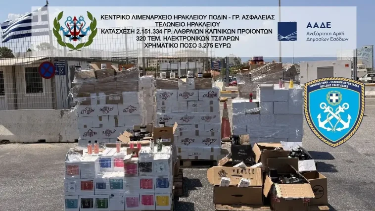 Το βράδυ της Τρίτης (12/11/25) συνελήφθη ο 57χρονος άνδρας για παράβαση του Εθνικού Τελωνειακού Κώδικα, καθώς στο μαγαζί που διατηρεί στο Ηράκλειο της Κρήτης, βρέθηκε σχεδόν ένας τόνος λαθραίος καπνός για ναργιλέ, τεράστια ποσότητα υγρών γλυκερίνης αλλά και ηλεκτρονικά τσιγάρα χωρίς το ειδικό σήμα του τελωνείου.