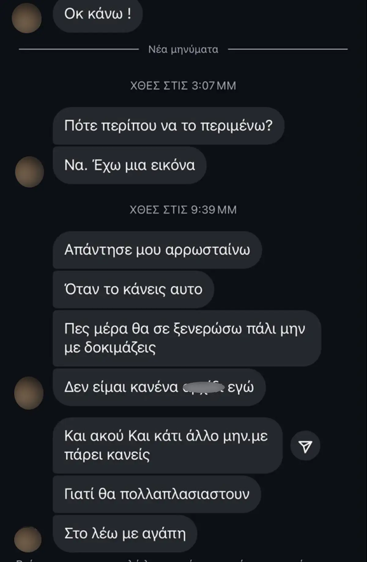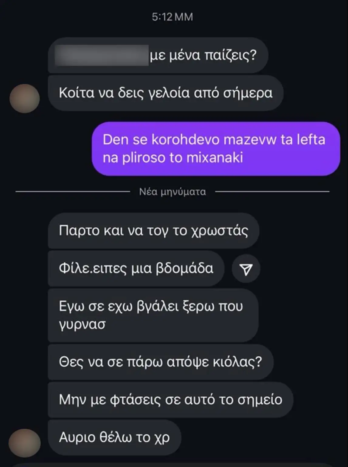 «Αύριο θέλω το χρήμα», έγραψε σε μήνυμά του ο 33χρονος απαγωγέας, ενώ από την πλευρά του το θύμα απάντησε: «Μετά από τόσα που πήρες δεν μπορείς να κάνεις λίγο υπομονή; Σου είπα θα στο δώσω».