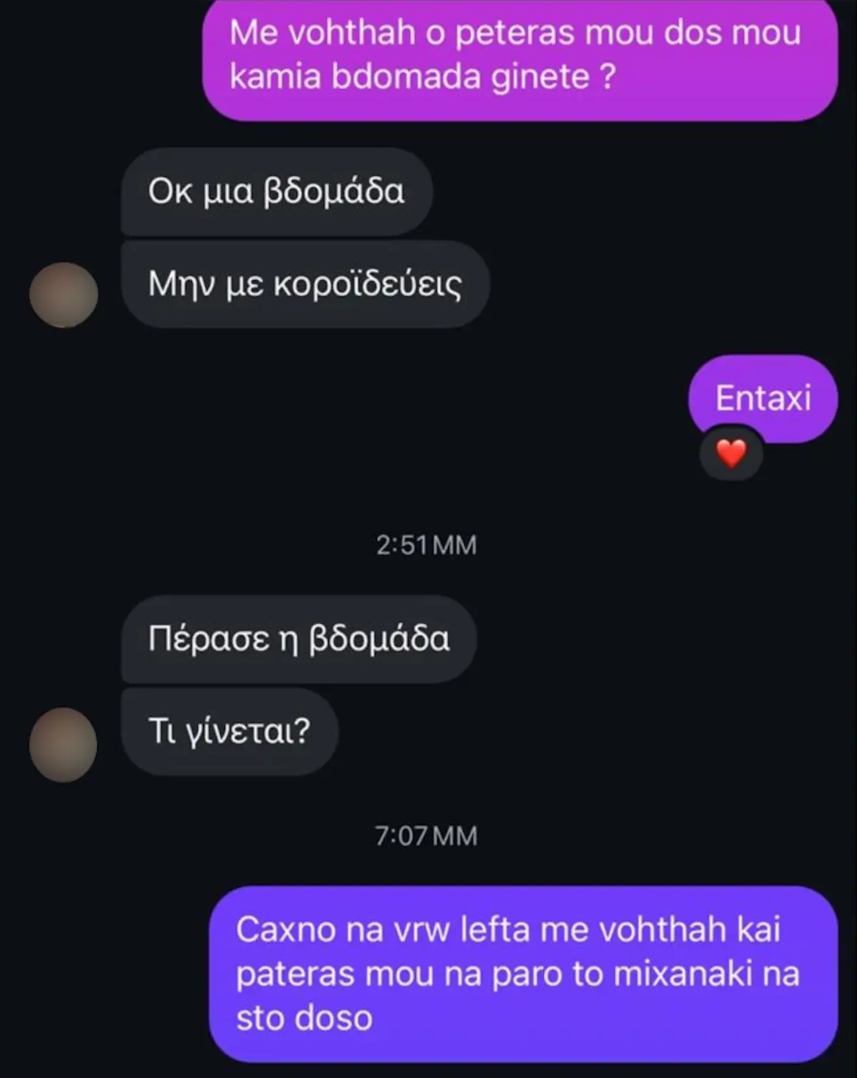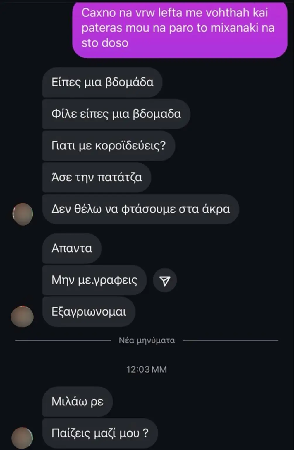 «Είπες μια βδομάδα… Παίζεις μαζί μου;.. Δεν θέλω να φτάσουμε στα άκρα», γράφει στο μήνυμα ο απαγωγέας, με τον 24χρονο να απαντά «με βοηθάει ο πατέρας μου, δώσμου καμιά βδομάδα, γίνεται;».