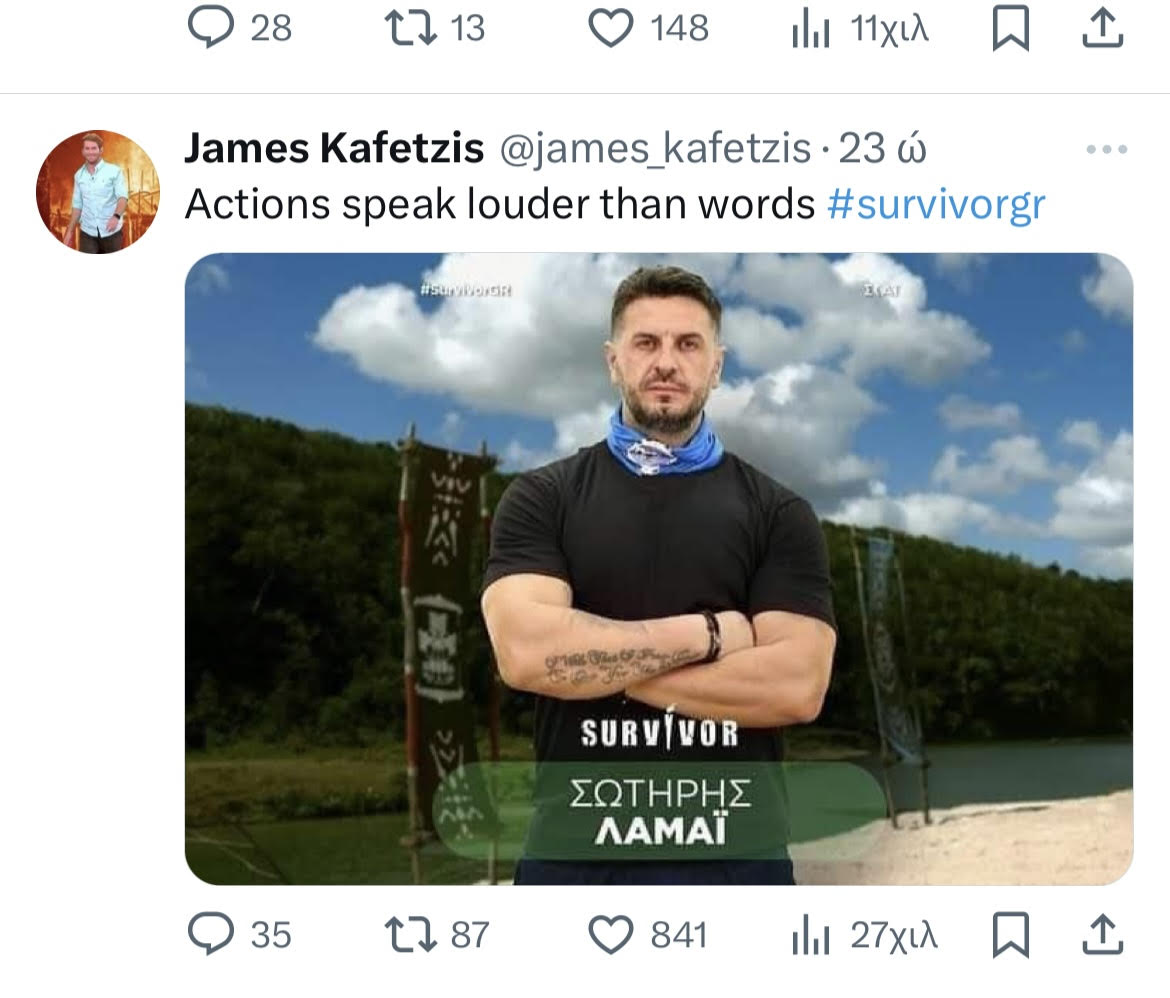 Ο Τζέιμς ήδη έδειξε την προτίμηση του και με ένα post χθες το βράδυ τάχθηκε υπέρ του Λαμάϊ που αποχώρησε οικειοθελώς. Έβαλε μια φωτογραφία του στο Twitter και εγραψε από κάτω « Οι πράξεις μιλούν πιο δυνατά από τα λόγια». Να σας θυμίσω ότι και εκείνος είχε αποχωρήσει οικειοθελώς καθώς όπως είχε αποκαλύψει ετοιμαζόταν να χάσει το μυαλό του όλα αυτά που βίωνε στο νησί.