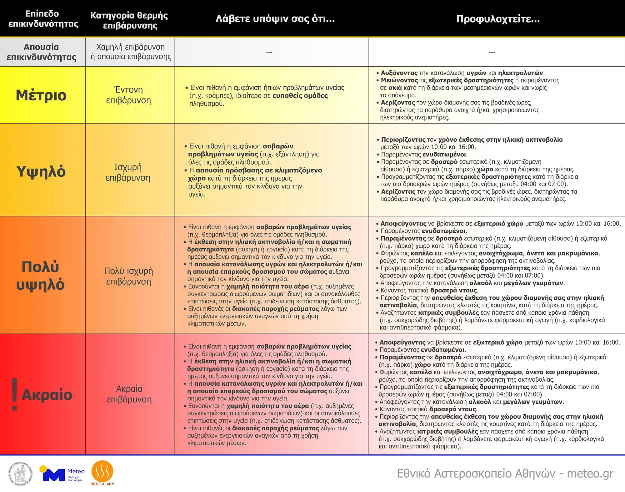 Για αυτό συνίσταται ισχυρά η εφαρμογή μέτρων προστασίας (π.χ. τακτικά δροσερά ντους) από όλες τις πληθυσμιακές ομάδες, και ιδιαίτερα από τις περισσότερο ευπαθείς (ηλικιωμένοι/ες, εργαζόμενοι/ες σε εξωτερικούς χώρους, παιδιά, εγκυμονούσες, άνθρωποι που πάσχουν από χρόνιες παθήσεις κ.α.). Περισσότερες σχετικές πληροφορίες παρέχονται στην επόμενη εικόνα.