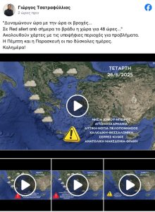 «Δυναμώνουν ώρα με την ώρα οι βροχές… Σε Red alert από σήμερα το βράδυ η χώρα για 48 ώρες… Ακολουθούν χάρτες με τις υποψήφιες περιοχές για προβλήματα. Η Πέμπτη και η Παρασκευή οι πιο δύσκολες ημέρες», αναφέρει στη νέα ανάρτησή του για την κακοκαιρία ο μετεωρολόγος.