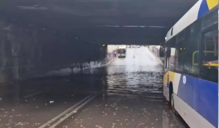 Στην υπόγεια διάβαση της οδού Δαβάκη στην Καλλιθέα ακινητοποιήθηκαν δύο λεωφορεία λόγω των υδάτων που είχαν συσσωρευθεί στον δρόμο.