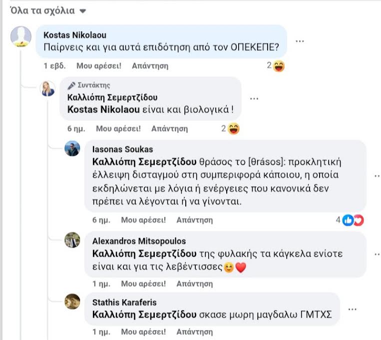 - Ωστόσο, αυτό, που ακολούθησε, ήταν μια σειρά από σχόλια με ύβρεις, ειρωνείες και υπονοούμενα εναντίον της. Ανάμεσά τους, ξεχωρίζει κι η αναφορά του ορισμού της λέξεως “θράσος” από έναν άλλον χρήστη , ο οποίος αποδίδει χαρακτηρισμό, με έμμεσο τρόπο, στην στάση της πρώην Συντονίστριας Κοινοτικών Πόρων και Γυναικείας Επιχειρηματικότητας.