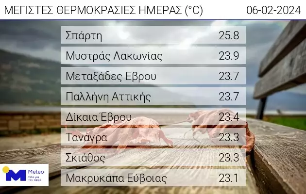 Ακολούθησαν ο Μυστράς με 23,9 βαθμούς Κελσίου, οι Μεταξάδες Έβρου με 23,7, η Παλλήνη με 23,7, τα Δίκαια Έβρου με 23,4, η Τανάγρα με 23,3, η Σκιάθος με 23,3 και η Μακρυκάπα Εύβοιας με 23,1.