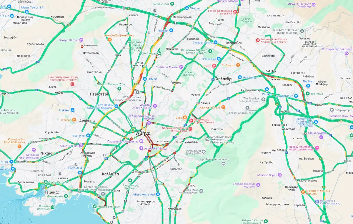 Τα προβλήματα στον Κηφισό, στο ρεύμα προς Πειραιά, ξεκινούν από τον κόμβο της Μεταμόρφωσης έως το ύψος της Νέας Φιλαδέλφειας και από το ύψος των Αγίων Αναργύρων έως την τελευταία έξοδο προς Πειραιά.