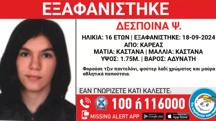 Σύμφωνα με ανακοίνωση που εξέδωσε το «Χαμόγελο του Παιδιού», τα ίχνη της 16χρονης Δέσποινας Ψ., χάθηκαν από την περιοχή του Καρέα.