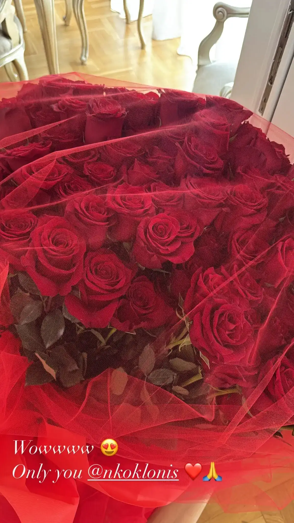Η παρουσιάστρια του Alpha κοινοποίησε σε Insta-story της την τεράστια ανθοδέσμη από κόκκινα τριαντάφυλλα που της έστειλε ο Νίκος Κοκλώνης ανήμερα των γενεθλίων της, σήμερα Πρωτομαγιά, γράφοντας ως σχόλιο «wow… only you».