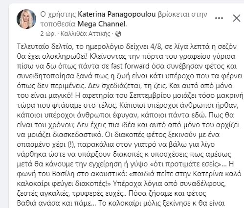 «Τελευταίο δελτίο, το ημερολόγιο δείχνει 4/8, σε λίγα λεπτά η σεζόν θα έχει ολοκληρωθεί Κλείνοντας την πόρτα του γραφείου γύρισα πίσω να δω όπως πάντα σε fast forward όσα συνέβησαν φέτος και συνειδητοποίησα ξανά πως η ζωή είναι κάτι υπέροχο που τα φέρνει όπως δεν περιμένεις. Δεν σχεδιάζεται, τη ζεις. Και αυτό από μόνο του είναι μαγικό! Η αφετηρία του Σεπτεμβρίου μοιάζει τόσο μακρινή τώρα που φτάσαμε στο τέλος. Κάποιοι υπέροχοι άνθρωποι ήρθαν, κάποιοι υπέροχοι άνθρωποι έφυγαν, κάποιοι πάντα εδώ. Πως θα είναι του χρόνου; Δεν έχεις πια ιδέα και αυτό από μόνο του αρχίζει να μοιάζει διασκεδαστικό. Οι διακοπές φέτος ξεκινούν με ένα σπασμένο χέρι (!), παρακάλια στον γιατρό να βάλω για λίγο νάρθηκα ώστε να υπάρξουν διακοπές κ υποσχέσεις πως αμέσως μετά θα κάνουμε την εγχείρηση ή γύψο «ότι προτιμάτε εσείς»… Η φωνή του Βασίλη στο ακουστικό: «παιδιά πείτε στην Κατερίνα καλό καλοκαίρι φεύγει διακοπές!» Υπέροχα λόγια από συναδέλφους, ζεστές αγκαλιές, τρυφερές ευχές.. Πόσα ζήσαμε και φέτος Βαθιά ανάσα και πάμε… Το καλοκαίρι μόλις ξεκίνησε κ θα είναι μαγικό!”
