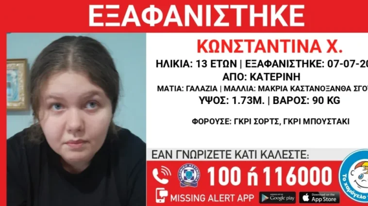 Συναγερμός έχει σημάνει στην περιοχή της Κατερίνης, για την εξαφάνιση μιας 13χρονης από το σπίτι της. «Το Χαμόγελο του Παιδιού» ενημερώθηκε για την εξαφάνιση της ανήλικης Κωνσταντίνας Χ. σήμερα και προχώρησε, κατόπιν αιτήματος της οικογένειας της, στην δημοσιοποίηση των στοιχείων της, καθώς ενδέχεται να συντρέχουν σοβαροί λόγοι που θέτουν τη ζωή της σε κίνδυνο. Η Κωνσταντίνα Χ. έχει ύψος 1.73 μ. ζυγίζει 90 κιλά, έχει μακριά καστανόξανθα σγουρά μαλλιά και γαλανά μάτια. Φορούσε γκρι σορτσάκι και γκρι μπουστάκι. Οποιοσδήποτε έχει κάποια πληροφορία, παρακαλείται να επικοινωνήσει τηλεφωνικά με «Το Χαμόγελο του Παιδιού» όλο το 24ωρο, στην «Ευρωπαϊκή Γραμμή για τα Εξαφανισμένα Παιδιά 116000», σε όλα τα Αστυνομικά Τμήματα της χώρας αλλά και μέσω της εφαρμογής Missing Alert app οπού υπάρχει ζωντανή ενημέρωση για την εξαφάνιση.
