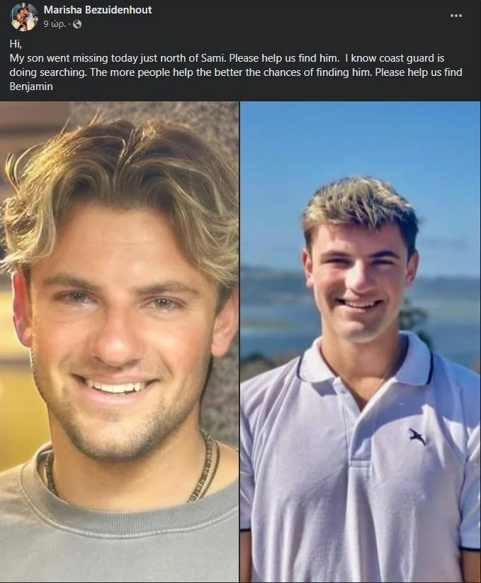 «Γεια σας, ο γιος μου εξαφανίστηκε σήμερα βόρεια της Σάμης. Παρακαλώ βοηθήστε μας να τον βρούμε. Ξέρω ότι η ακτοφυλακή κάνει έρευνες. Όσο περισσότεροι άνθρωποι βοηθήσουν, τόσο περισσότερες είναι οι πιθανότητες να τον βρούμε. Σας παρακαλώ βοηθήστε μας να βρούμε τον Μπέντζαμιν», είχε γράψει η μητέρα του 20χρονου αγνοούμενου σε ανάρτηση στο Facebook