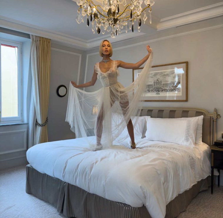 - Η Μαρία Ολυμπία, φωτογραφίζεται πάνω σ’ ένα κρεβάτι για στο περιοδικό φορώντας κάτι που θυμίζει κουρτίνα η κουρέλι.