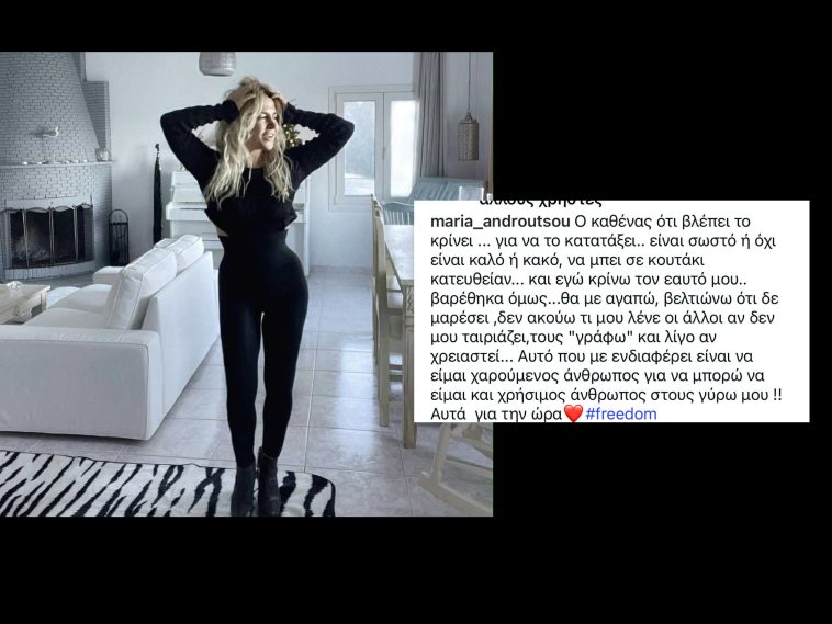 Η γνωστή ηθοποιός, με μια φωτογραφία όπου ποζάρει φορώντας ολόσωμη φόρμα σε στυλ Λάρα Κροφτ, εξήγησε πως «ο καθένας κρίνει για να κατατάξει κάποιον κάπου», όμως εκείνη πια κουράστηκε να δίνει σημασία στα σχόλια. Όπως τονίζει, αυτό που την ενδιαφέρει πάνω απ’ όλα είναι «να είναι χαρούμενος άνθρωπος και χρήσιμη στους γύρω της».