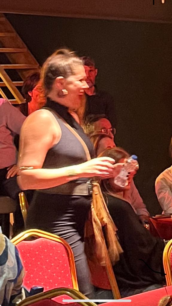 Η ηθοποιός έφτασε αργοπορημένη, φορούσε μαύρα και μποτάκια και κάθισε στο τραπέζι δίπλα στον Βασίλη Μπισμπίκη.