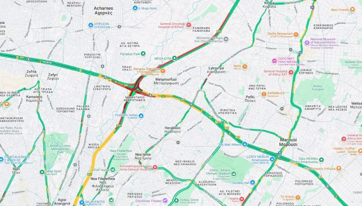 Αλλά και η Λεωφόρος Κηφισίας είναι απρποσπέλαστη, με το μεγαλύτερο μποτιλιάρισμα να σημειώνεται στο ύψος του Ψυχικού.