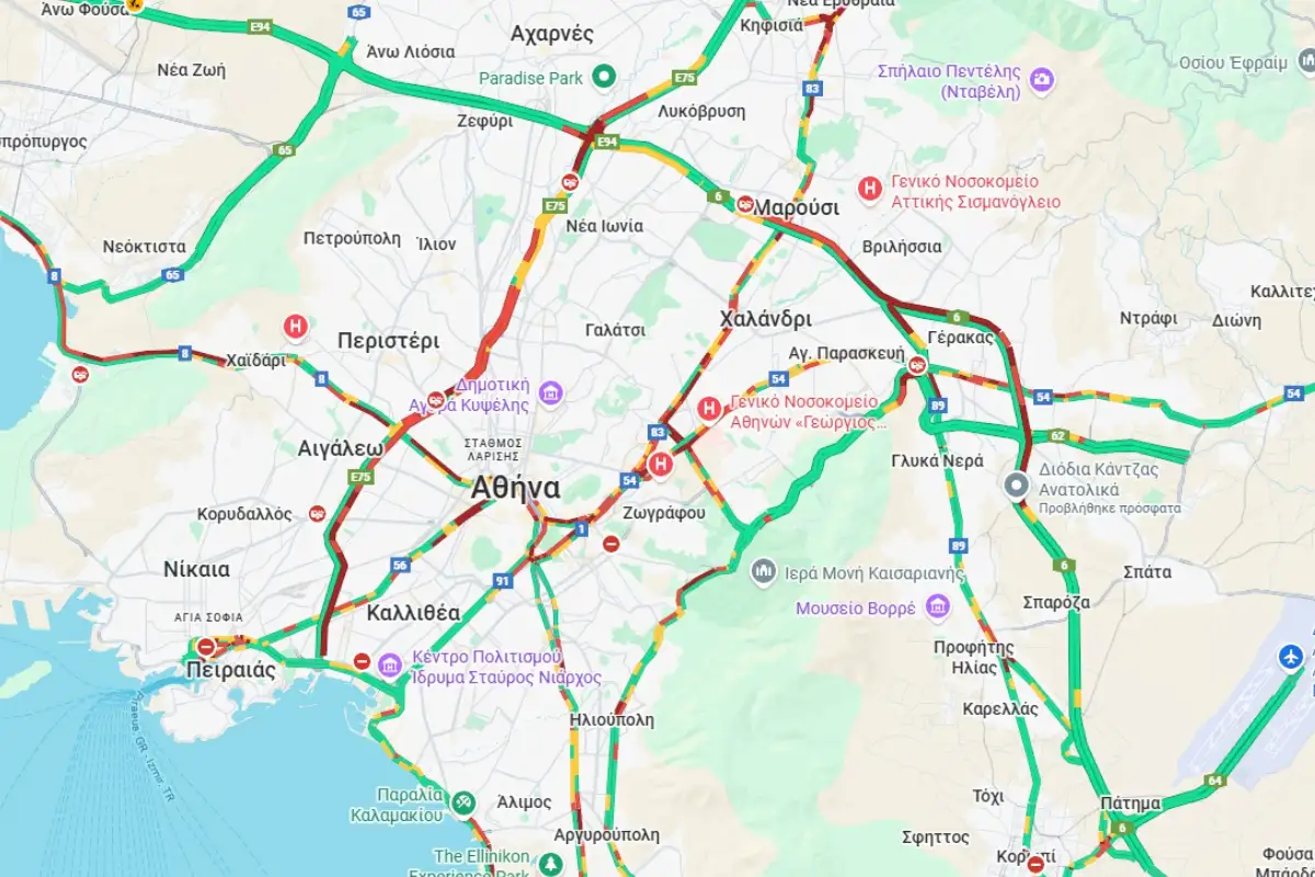 Στο «κόκκινο» είναι και οι δρόμοι γύρω από το κέντρο της Αθήνας, το λιμάνι του Πειραιά, την Βουλιαγμένης στο ύψος της Γλυφάδας αλλά και η Ποσειδώνος, στο ρεύμα προς Πειραιά, στο ύψος του Ελληνικού.