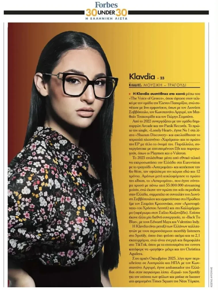 Η Klavdia πλέον βρίσκεται στη φετινή λίστα Forbes “30 Under 30”, ανάμεσα στους πιο επιτυχημένους Έλληνες κάτω των 30 ετών, μια διάκριση που επιβεβαιώνει πως η πορεία της μόλις ξεκινά και ήδη ξεχωρίζει.