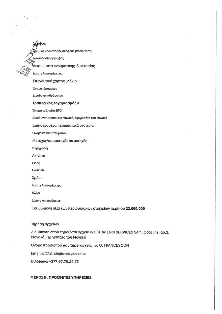 Σε ένα από αυτά τα έγγραφα της Trident, που έχει συνταχθεί τον Απρίλιο του 2021 και είναι μια φόρμα πληροφοριών ουσιαστικά, ο Φρανσεσκόν αναφέρει την τράπεζα EFG Eurobank στο Μονακό, στο πεδίο «περιουσιακό στοιχείο» γράφει «τραπεζικός λογαριασμός» και στις λεπτομέρειες επισημαίνει: «εκτιμώμενη αξία των περιουσιακών στοιχείων, 22.000.000 ευρώ». Σας αποστέλλουμε συνημμένα τα έγγραφα που λάβαμε κατόπιν προσφυγής του Ιωάννη Τράγκα και του Ελληνα συνεκτελεστή Στέφανου Βασιλάκη στο Ανώτατο Δικαστήριο της Ανατολικής Καραϊβικής (Δικαιοδοσία British Virgin Islands), η οποία έγινε δεκτή από το Δικαστήριο (είχε προηγηθεί η αίτηση Seal & Gag με την οποία είχε ανωνυμοποιηθεί ο φάκελος και δεν είχε γνωστοποιηθεί η διαδικασία στη Διοίκηση της Family Line).
