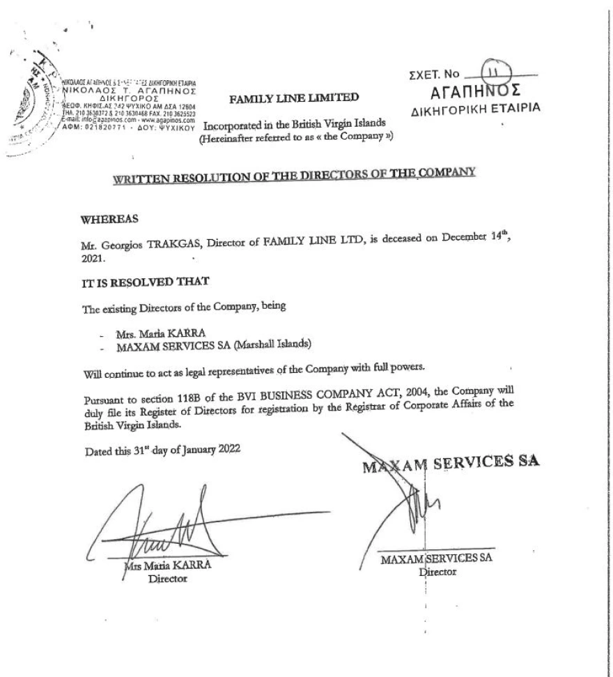 Πρόκειται για την offshore που ίδρυσε ο εκλιπών στις 22 Μαΐου του 2012 στο εξωτικό νησιωτικό σύμπλεγμα των Βρετανικών Παρθένων Νήσων, εκεί όπου ο Γιάννης Τράγκας πέτυχε άλλη μια νίκη προ ημερών. Στα τέλη του καλοκαιριού προσέφυγε στο Ανώτατο Δικαστήριο της Ανατολικής Καραϊβικής -εκεί υπάγονται οι Βρετανικές Παρθένες Νήσοι- ζητώντας να του επιτραπεί η πλήρης πρόσβαση στα αρχεία της Family Line LTD, τα οποία αρνούνταν να του παραδώσει η χήρα του εκδότη, Μαρία Καρρά.