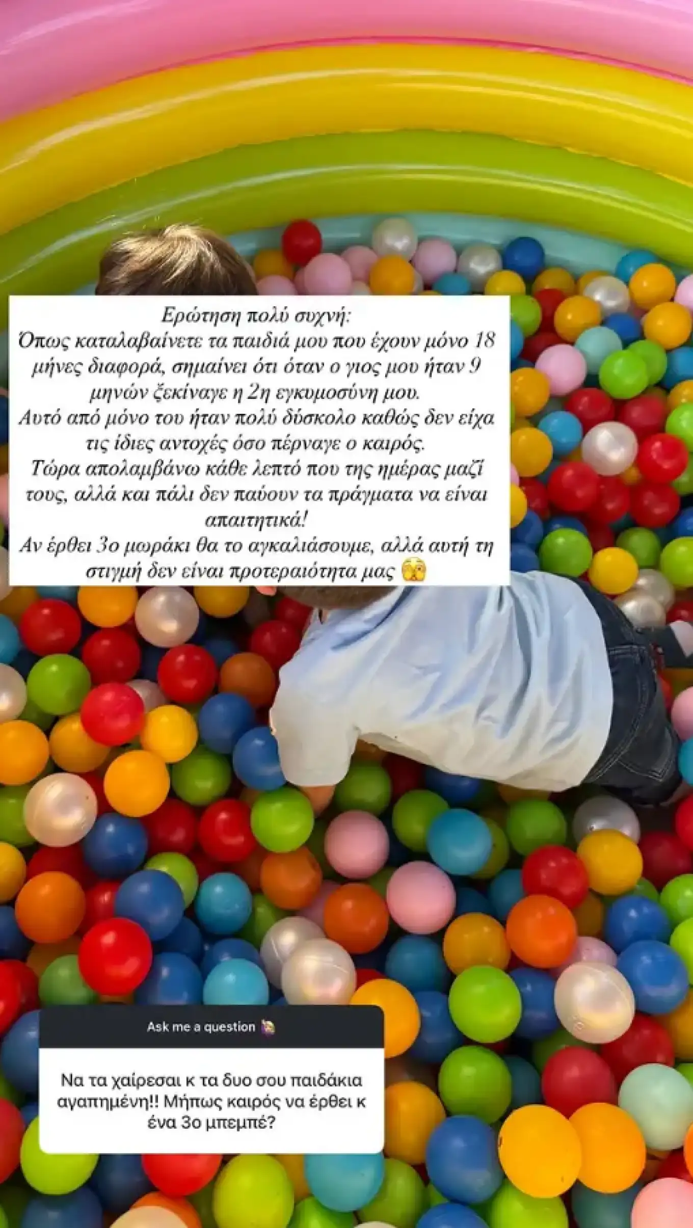 «Όπως καταλαβαίνετε, τα παιδιά μου έχουν μόλις 18 μήνες διαφορά, που σημαίνει ότι όταν ο γιος μου ήταν 9 μηνών ξεκινούσε η δεύτερη εγκυμοσύνη μου. Αυτό ήταν από μόνο του πολύ δύσκολο, αφού όσο περνούσε ο καιρός δεν είχα τις ίδιες αντοχές. Τώρα απολαμβάνω κάθε λεπτό της ημέρας μαζί τους, όμως τα πράγματα παραμένουν απαιτητικά. Αν έρθει ένα τρίτο μωράκι θα το αγκαλιάσουμε, αλλά αυτή τη στιγμή δεν αποτελεί προτεραιότητά μας», απάντησε χαρακτηριστικά η Κωνσταντίνα Σπυροπούλου.