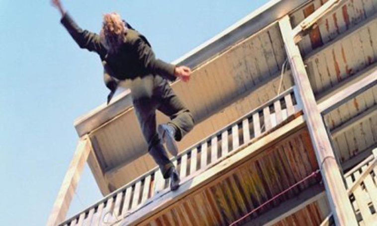 - Ο άνδρας φαίνεται να στέκεται στο μπαλκόνι έξω από το κάγκελα ακουμπώντας στα σίδερα της τέντας και απειλεί να πηδήξει.