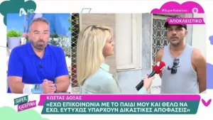 - «Δυστυχώς η διαδικασία που θα ακολουθηθεί είναι πολύ μεγάλη και πιστεύω ότι θα έχει αίσιο τέλος. Η επόμενη δικάσιμος ορίστηκε για τις 15 Δεκεμβρίου και ελπίζω να γίνει. Εμείς θα είμαστε εκεί. Καλό θα ήταν να είχαμε επαφές με την πρώην σύζυγό μου και να υπήρχε συνεννόηση, γιατί υπάρχει ένα παιδί. Υπάρχει η Σοφία και πρέπει να συννενοούμαστε. Κάνω τα πάντα, είμαι κάθε βδομάδα στη Θεσσαλονίκη για το παιδί. Ευτυχώς υπάρχουν δικαστικές αποφάσεις που το ορίζουν κι αυτό», είπε αρχικά ο Κώστας Δόξας και συνέχισε: