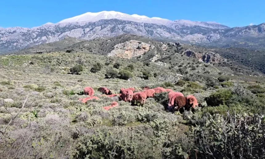 Ένα ασυνήθιστο οπτικό στιγμιότυπο καταγράφηκε στην κρητική ύπαιθρο, όπου ένα κοπάδι προβάτων με έντονο κοκκινωπό χρώμα εμφανίστηκε στο χιονισμένο τοπίο της περιοχής. Έγχρωμο μαρκάρισμα κοπαδιού ως μέτρο προστασίας στη Μεσαρά