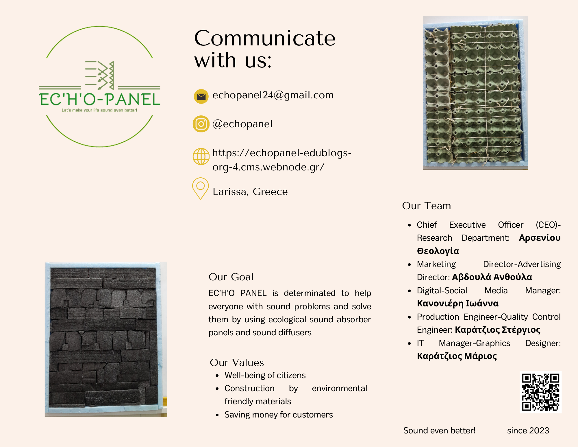 Μια οικολογική απάντηση στο πρόβλημα του κακού ήχου σε μεγάλους χώρους ενέπνευσε σε μαθητές της Λάρισας η δυσκολία να παρακολουθήσουν το μάθημα της γυμναστικής στο γυμναστήριο του σχολείου τους. Η διεξαγωγή αθλητικών ή και πολιτιστικών δραστηριοτήτων στο γυμναστήριο του 10ου Γενικού Λυκείου Λάρισας είχε αποδειχθεί μία θορυβώδης υπόθεση κι αυτό γιατί παρά το ότι πρόκειται για σχετικά νέα κατασκευή, ο αντίλαλος και η κακή διάχυση του ήχου δυσκόλευαν καθηγητές, μαθητές, προσκεκλημένους ομιλητές να ακούσουν και να ακουστούν. Σκεπτόμενοι τρόπους να βελτιώσουν την καθημερινότητα στη σχολική τους ζωή τρεις μαθήτριες και δύο μαθητές της Α’ Λυκείου βρήκαν μία περιβαλλοντικά βιώσιμη και οικονομική λύση στο πρόβλημα. Αξιοποιώντας την επιτυχή παράδοση ετών συμμετοχής του σχολείου τους στο πρόγραμμα «Εικονική Επιχείρηση» που διοργανώνει το JA Greece και υπό την καθοδήγηση του εκπαιδευτικού τους στην Πληροφορική Ζήση Καρασίμου, οι μαθητές Στέργιος Καράτζιος, Μάριος Καράτζιος, Ιωάννα Κανονιέρη, Ανθούλα Αβδουλά και Θεολογία Αρσενίου εξέλιξαν την ιδέα τους σε επιχειρηματική πρόταση, παρουσιάζοντας στη Θεσσαλονίκη, στη Μαθητική Εμπορική Έκθεση Θεσσαλονίκης 2024 του Junior Achievement Greece, την εικονική μαθητική επιχείρηση «EC’H’O-PANEL».