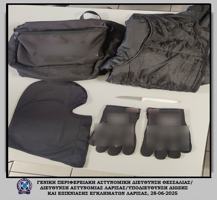 Στην κατοχή του βρέθηκαν και κατασχέθηκαν -1- τσάντα πλάτης, -1- κουκούλα τύπου «fullface», -1- ζευγάρι γάντια, -1- ζακέτα και -1- μαχαίρι κουζίνας.