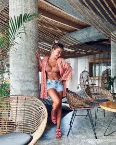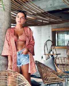 Επέλεξε ένα κοντό τζιν σορτάκι, συνδυασμένο με υπέροχο μπούστο από το μπικίνι της και κιμονό στο ίδιο μοτίβο!