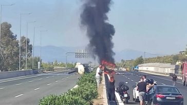 Το βυτιοφόρο που κινούνταν στη λεωφόρο Σχιστού, μετέφερε υγραέριο και σύμφωνα με πληροφορίες, υπάρχει διαρροή.