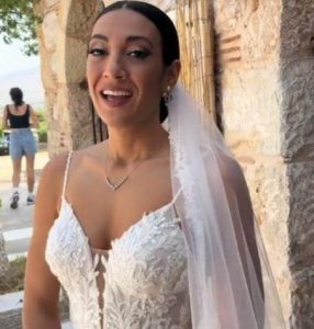 Η «Στέλλα Καμαριωτάκη» η ηρωίδα που υποδύεται στον “Σασμό” η Ευγενία Σαμαρά, ετοιμάζεται να ανέβει τα σκαλιά της εκκλησίας.