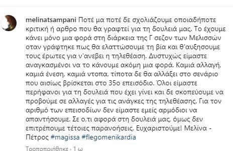 «Ποτέ μα ποτέ δε σχολιάζουμε οποιαδήποτε κριτική ή αρθρο που θα γραφτεί για τη δουλειά μας. Το έχουμε κάνει μόνο μια φορά στη διάρκεια της Γ σεζον των Μελισσών οταν γράφτηκε πως θα ελαττώσουμε τη βία και θ’αυξησουμε τους έρωτες για ν’ανεβει η τηλεθέαση. Δυστυχώς είμαστε αναγκασμένοι να το κάνουμε ακόμη μια φορά. Καμιά αλλαγή, καμιά ένεση, καμιά ντοπα, τίποτα δε θα αλλάξει στο σενάριο που αισίως βρίσκεται στο 35ο επεισόδιο. Όλοι είμαστε περήφανοι για τη δουλειά που έχει γίνει και δε σκοπεύουμε να προβούμε σε αλλαγές για τις ανάγκες της τηλεθέασης. Για τον αριθμό των επεισοδίων δεν είμαστε εμείς αρμόδιοι να απαντήσουμε. Σε ο,τι αφορά στη δουλειά μας, όμως δεν επιτρέπουμε τέτοιες παρανοήσεις. Ευχαριστούμε! Μελίνα – Πέτρος»