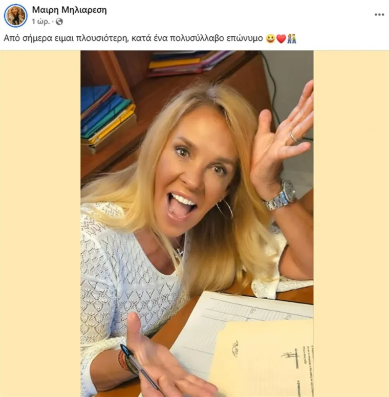 «Από σήμερα ειμαι πλουσιότερη, κατά ένα πολυσύλλαβο επώνυμο…», έγραψε στην ανάρτηση που έκανε το απόγευμα της Τετάρτης 9/7.