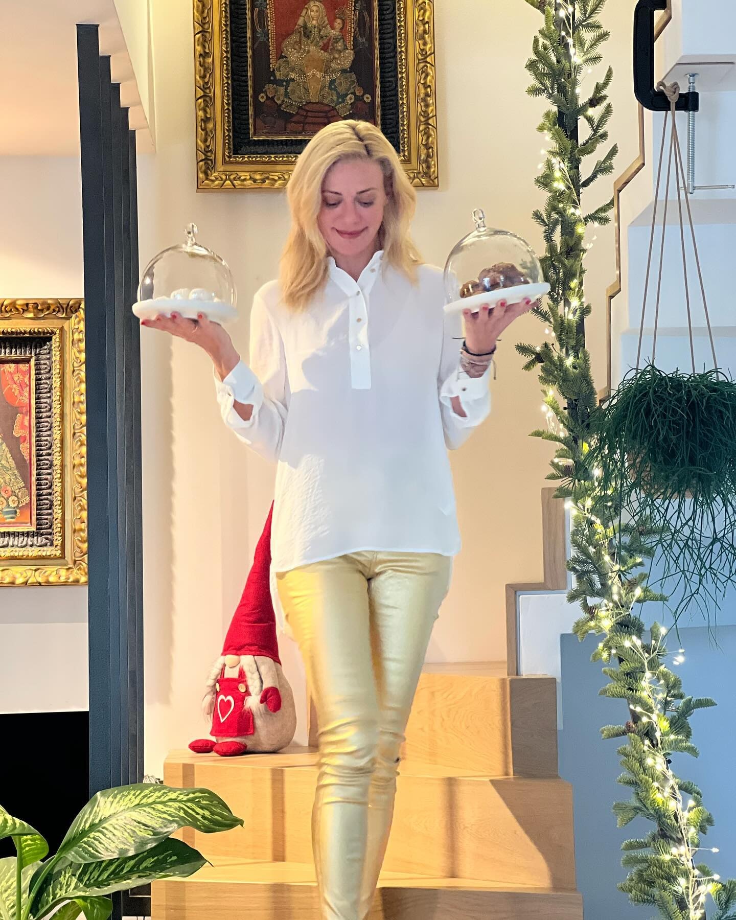 Σπάνιες εικόνες μέσα από το σπίτι της μοιράστηκε η Ζέτα Μακρυπούλια.Η παρουσιάστρια πόζαρε στο σαλόνι της χαμογελαστή και σε Christmas πόζες κρατώντας γυάλες με γλυκά Χριστουγεννιάτικα. Εκτός βέβαια από το ιδιαίτερο δέντρο της, λευκό, μικρό και με υπέροχα στολίδια, μας εντυπωσίασε και η υπέροχη εμφάνισή της.Μεταλλιζέ παντελόνι και χρυσή απόχρωση και λευκό πουκάμισο, ιδανικό σύνολο για τις γιορτινές ημέρες.Όπως θα δεις και στις φωτογραφίες στο σπίτι της κυριαρχεί το ξύλο με εσωτερική σκάλα που ενώνει τους δυο ορόφους, είναι φωτεινό και με πολλά όμορφα διακοσμητικά.