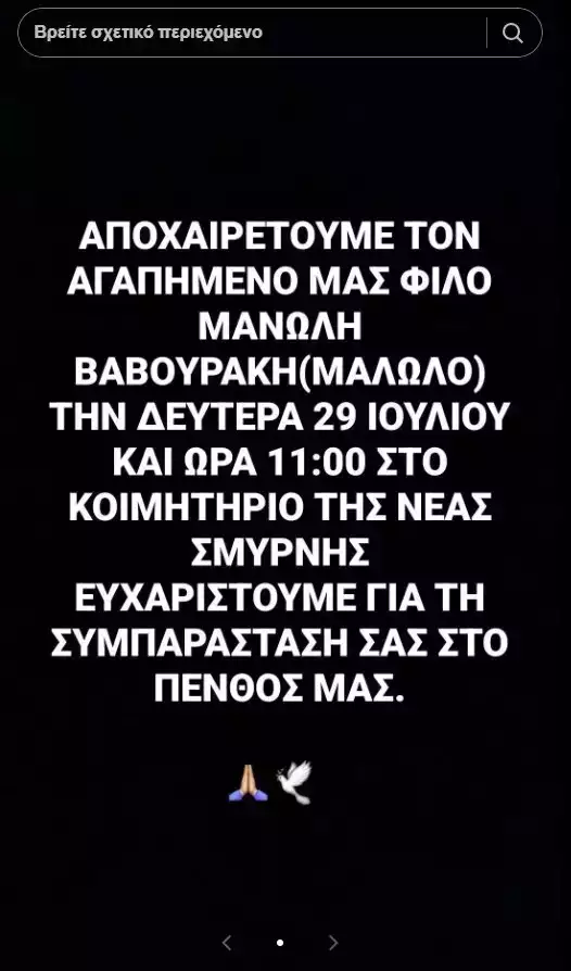 «Αποχαιρετούμε τον αγαπημένο μας φίλο Μανώλη Βαβουράκη (Μανώλο) την Δευτέρα 29/7 και ώρα 11:00 στο κοιμητήριο της Νέας Σμύρνης. Ευχαριστούμε για την συμπαράστασή σας στο πένθος μας», ανακοίνωσε ο καλός του φίλος, Γιώργος Κεσίδης.