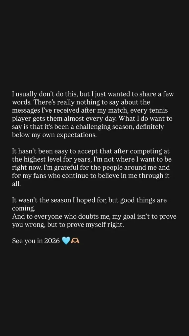 - «Συνήθως δεν το κάνω αυτό, αλλά ήθελα απλώς να μοιραστώ μερικά λόγια. Δεν υπάρχει πραγματικά κάτι να πω για τα μηνύματα που έλαβα μετά τον αγώνα μου – κάθε τενίστρια τα λαμβάνει σχεδόν κάθε μέρα. Αυτό που θέλω να πω είναι ότι ήταν μια δύσκολη σεζόν, σίγουρα κάτω από τις δικές μου προσδοκίες. Δεν ήταν εύκολο να αποδεχτώ ότι, μετά από χρόνια αγώνων στο υψηλότερο επίπεδο, δεν βρίσκομαι εκεί που θα ήθελα αυτή τη στιγμή. Είμαι ευγνώμων για τους ανθρώπους γύρω μου και για τους θαυμαστές μου που συνεχίζουν να πιστεύουν σε μένα μέσα απ’ όλα αυτά. Δεν ήταν η σεζόν που ήλπιζα, αλλά έρχονται καλά πράγματα. Και σε όλους όσοι με αμφισβητούν, ο στόχος μου δεν είναι να σας αποδείξω ότι έχετε άδικο, αλλά να αποδείξω στον εαυτό μου ότι έχω δίκιο. Τα λέμε το 2026».