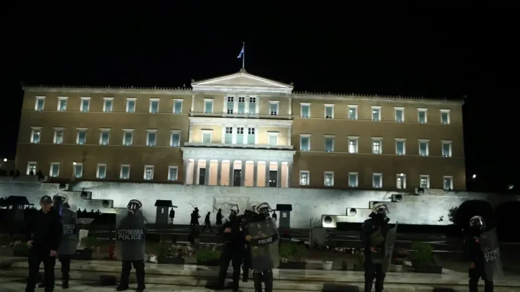 Διμοιρίες των ΜΑΤ, σχημάτισαν αλυσίδα στο μνημείο του Άγνωστου Στρατιώτη καθώς έφτασε, νωρίς το βράδυ της Πέμπτης (23.10.2025) η φοιτητική πορεία στο Σύνταγμα.