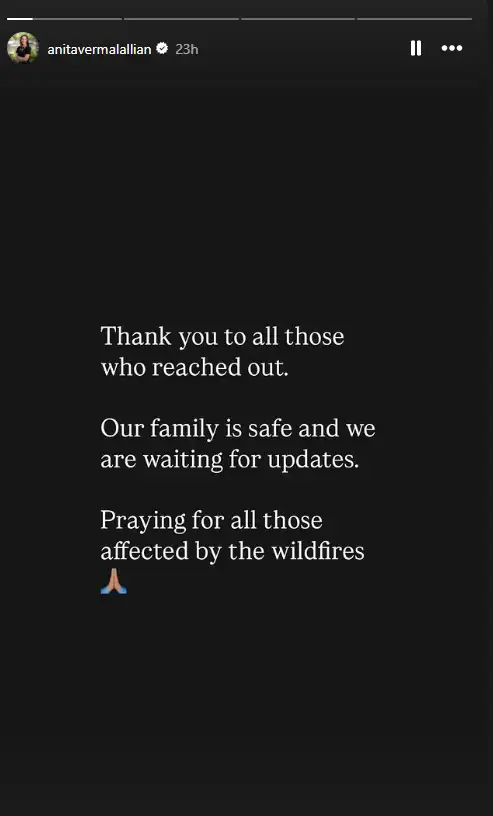 Η Verma-Lallian επιβεβαίωσε μέσω Instagram Story ότι η ίδια και η οικογένειά της είναι «ασφαλείς» και πως το σπίτι σώθηκε ως εκ θαύματος από την καταστροφική πυρκαγιά -με ελάχιστες ζημιές στην πίσω αυλή- ενώ παράλληλα ευχαριστεί την «καταπληκτική» κοινότητά της που βοήθησε στη διατήρηση του ακινήτου.