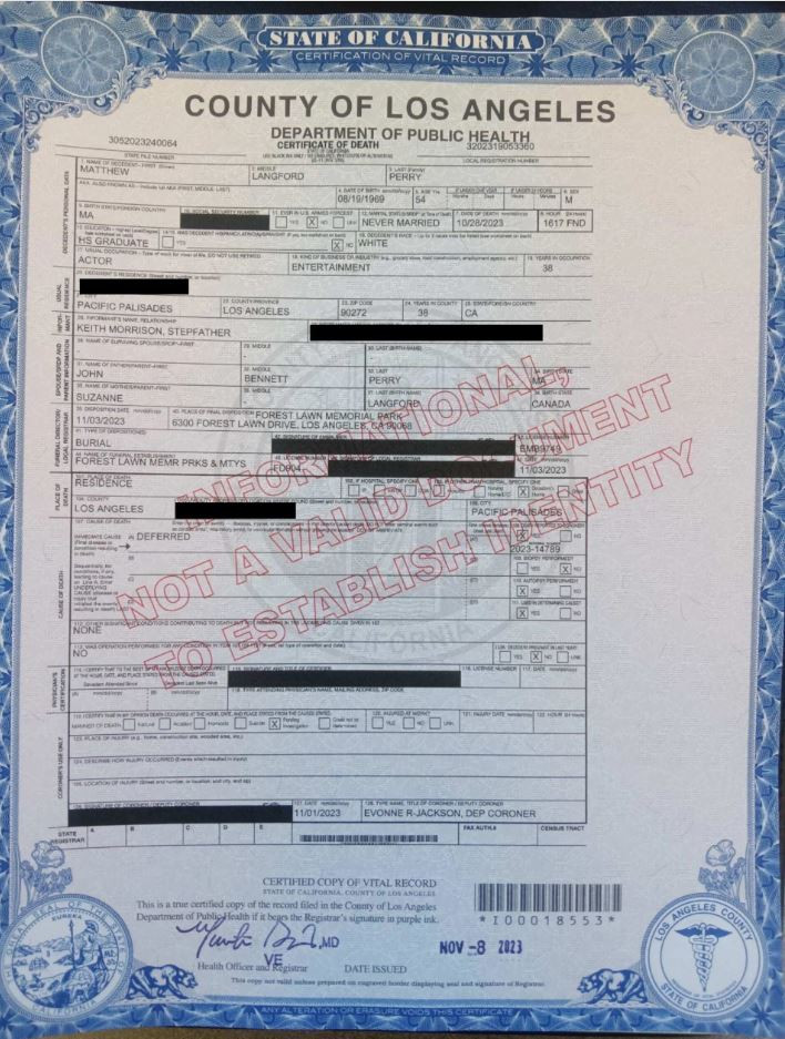 - Το έγγραφο επιβεβαιώνει ότι ο ηθοποιός πέθανε στο Forest Lawn του Λος Άντζελες και ότι έγινε νεκροτομή – νεκροψία. Ωστόσο, η επίσημη αιτία θανάτου του Μάθιου Πέρι παραμένει ανοιχτή.