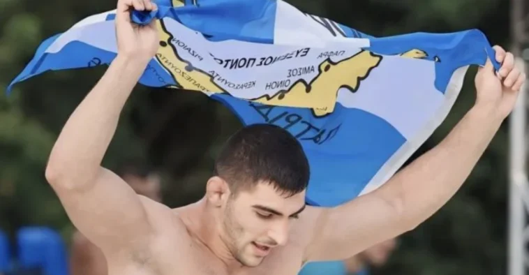 Ο νεαρός αξιωματικός της Πυροσβεστικής έκανε τον γύρο του θριάμβου μετά την επικράτησή του, ανεμίζοντας και φιλώντας την ελληνική σημαία του Πόντου!