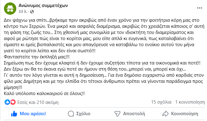 Πολύ πρόσφατα, μια ανάρτηση σε μέσο κοινωνικής δικτύωσης και πιο συγκεκριμένα σε σελίδα εύρεσης κατοικιών, μου κέντρισε το ενδιαφέρον, με συγκίνησε και πάντως με εξέπληξε ευχάριστα.